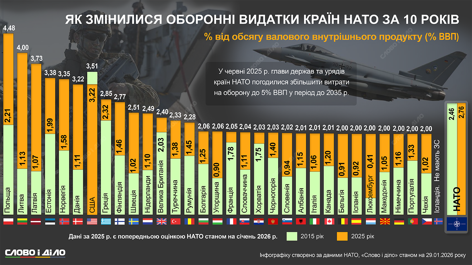 На саммите в Гааге в июне прошлого года главы государств и правительств стран НАТО договорились увеличить оборонные расходы до 5% ВВП в год до 2035 года. Причина – долговременная и растущая угроза со стороны страны-агрессорки россии, которая с 2022 года ведет войну против Украины, а также давление президента США Дональда Трампа.