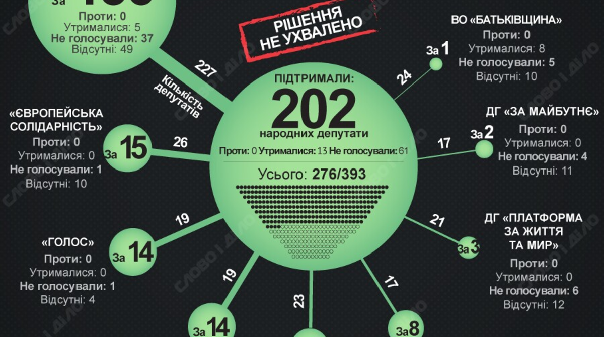 По фракциям результаты голосования были такими: «Слуга народа» – «за» 136, против – 0, воздержались – 5, не голосовали – 37 (отсутствовало 49 нардепов); ДГ «За жизнь и мир» (бывшая ОПЗЖ): за – 3, против – 0, воздержались – 0, не голосовали – 6 (отсутствувало (12); Европейская солидарность: за – 15, против – 0, воздержались – 0, не голосовали – 1 (отсутствувало – 10); Батькивщина: за – 1, против – 0, воздержались – 8, не голосовали – 5 (отсутствовали – 10); ДГ «Доверие»: за – 14, против – 0, воздержались – 0, не голосовали – 1 (отсутствуют – 4); «Голос»: за – 14, против – 0, воздержались – 1, не голосовали – 1 (отсутствуют – 4); ДГ «Восстановление Украины»: за – 8, против – 0, воздержались – 0, не голосовали – 2 (отсутствовали – 7). Что касается 23 внефракционных нардепов, то из них отдали голос «за» 9 человек, не голосовали – 4. Против или воздержались – 0.
