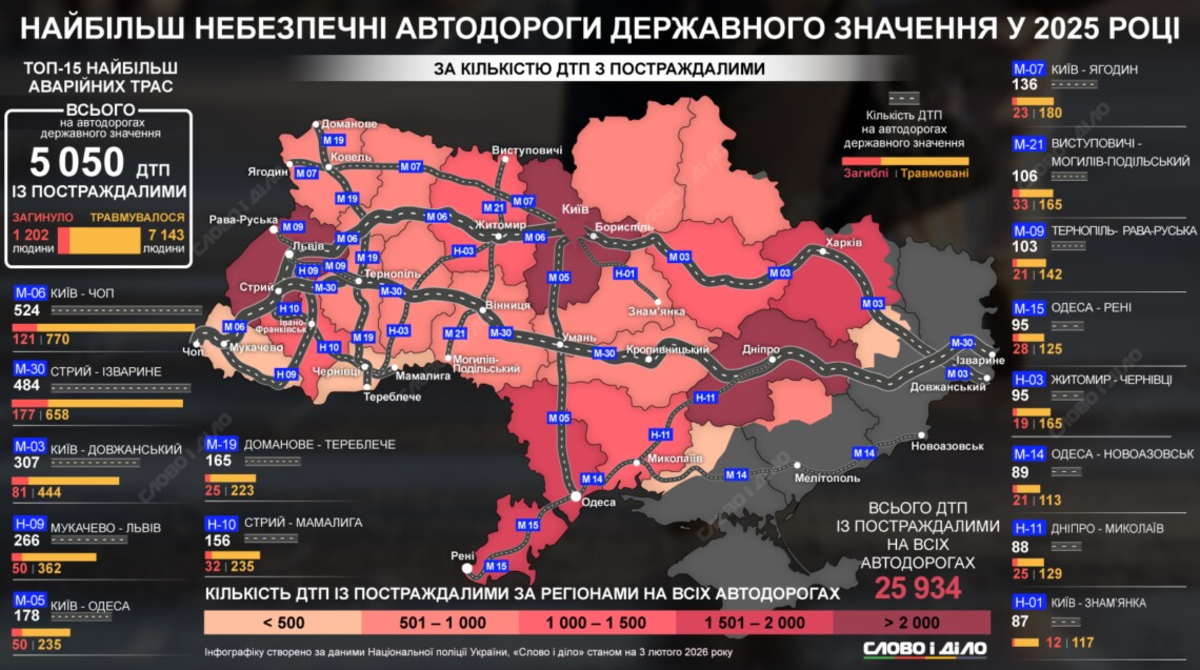 Самой опасной оказалась трасса международного значения М-06 Киев-Чоп. Она имеет протяженность более 900 км и проходит через пять областей: Киевскую, Житомирскую, Ровненскую, Львовскую и Закарпатскую и соединяет Киев с западной границей (Венгрией). На этой автодороге в 2025 году произошло 524 аварии, в которых погиб 121 человек, травмировались – 770.