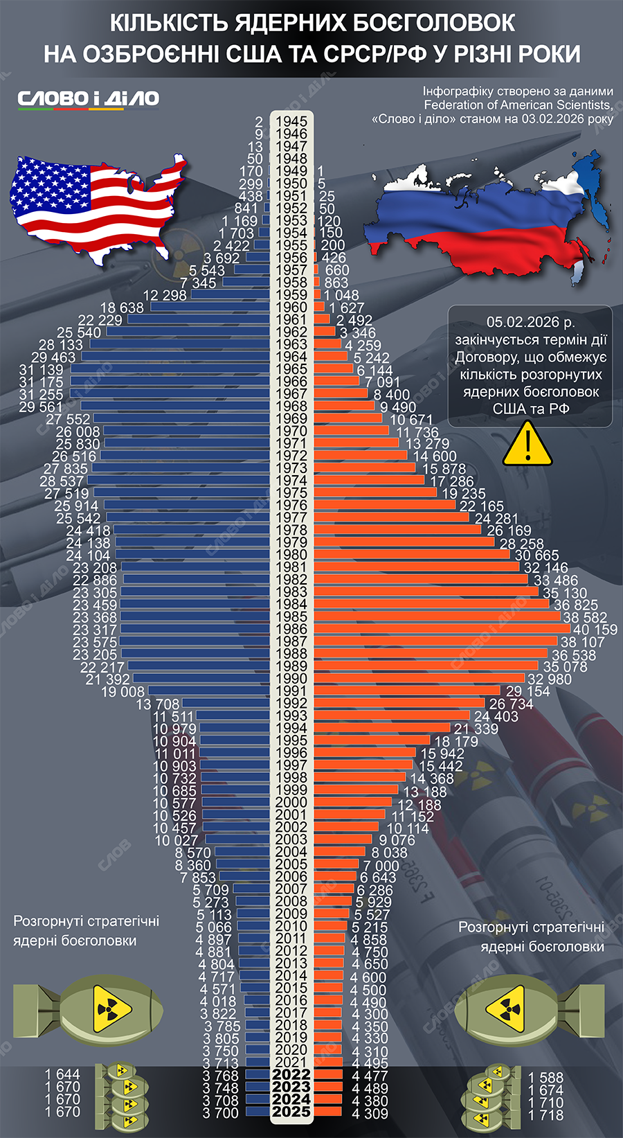 Уже завтра, 5 февраля, истекает срок действия Договора об ограничении ядерного оружия США и россии. Два ведущих ядерных государства мира останутся без фундаментального документа, который бы ограничивал и контролировал их ядерные арсеналы. Между тем россияне, не раз прибегавшие к ядерному шантажу в войне против Украины, уже заявили о так называемом «опасном» моменте на фоне истечения срока действия Договора. «Слово и дело» решило посмотреть, какое количество ядерных боеголовок имели США и россия за последние 80 лет и сколько из них было развернуто с 2022 по 2025 год.