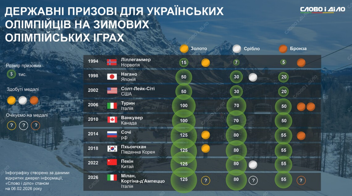 Сегодня, 6 февраля, в Италии зажжется огонь XXV зимней Олимпиады, на период которой президент страны призывал к глобальному перемирию. Украину в этом году представляют 46 спортсменов, которые будут соревноваться в 11 видах спорта. Сумма призовых на Играх-2026 для украинцев составляет 125 тысяч долларов за «золото», 80 тысяч долларов за «серебро» и 55 тысяч долларов за «бронзу». «Слово и дело» предлагает посмотреть, какие призовые украинские спортсмены получали на зимних Олимпиадах в предыдущие годы.