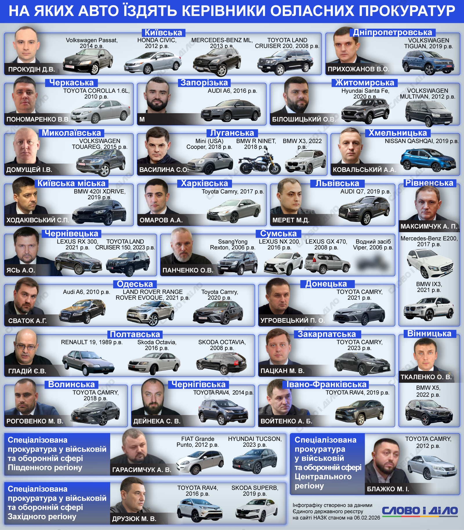 У руководителей областных и специализированных прокуратур Украины есть десятки транспортных средств – от автомобилей конца 1980-х годов до новых моделей премиум класса 2022-2023 годов выпуска. Об этом свидетельствуют данные Единого государственного реестра деклараций НАПК. Аналитики «Слово и дело» проанализировали самые доступные декларации прокуроров, представленные весной 2025 года. Подробнее – на инфографике.