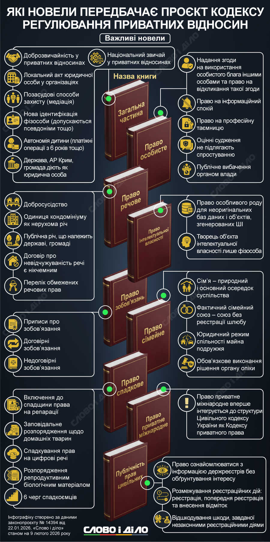 Документ объемом 832 страницы должен стать обновленным основанием для регулирования частноправовых отношений в Украине. В пояснительной записке к законопроекту сказано, что новая редакция поможет адаптировать законодательство к европейским нормам, цифровизации и современным экономическим моделям, включая обновления в сфере личных прав, интеллектуальной собственности и наследования.