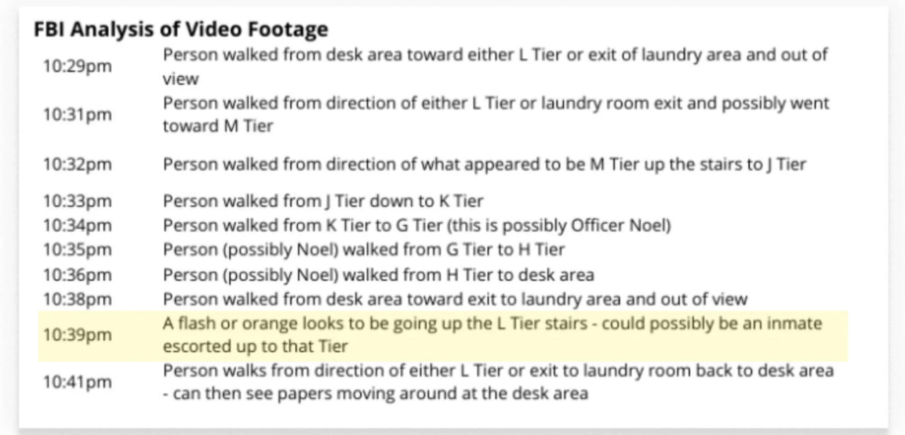 В 20:00 9 августа все заключенные были заперты в камерах, включая Эпштейна, который остался один. Записи показывают, что после 22:40 обходы и проверки его камеры не проводились, а обязательные пересчеты заключенных после 16:00 были сфальсифицированы.