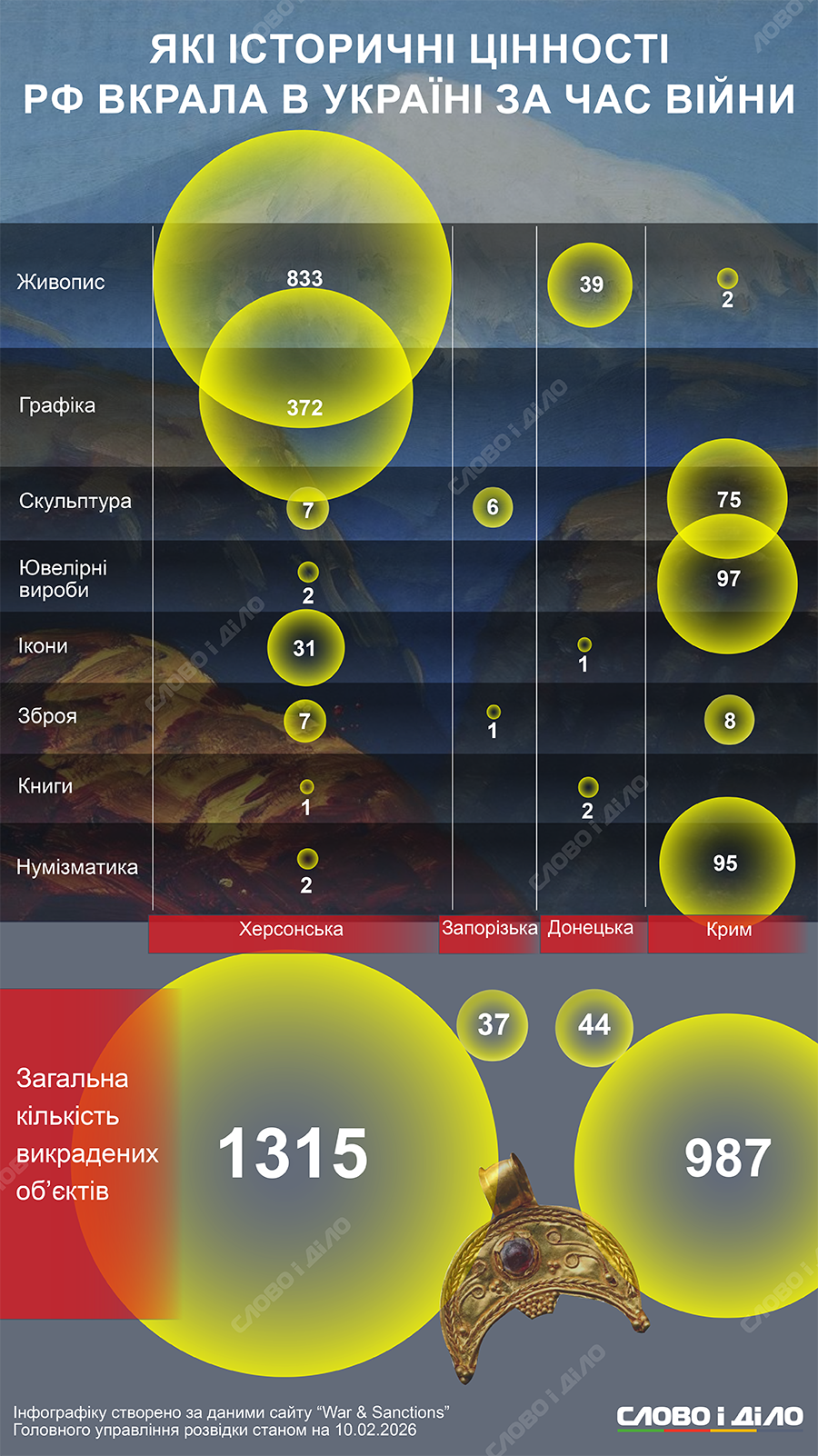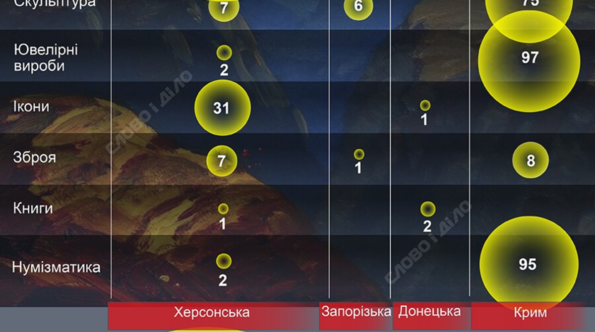 Наибольшие культурные потери понесла Херсонщина, в регионе идентифицировано 1315 похищенных объектов. Основная часть коллекции была вывезена из Херсонского областного художественного музея им. А.А. Шовкуненко, откуда исчезли 1248 экспонатов. Еще 63 объекта похищены из Херсонского краеведческого музея и 4 – из Новокаховской городской картинной галереи им. А.С. Гавдзинского. на втором месте – Крым, который рф начала аннексировать с 2014 года. С полуострова оккупанты вывезли 987 ценностей, больше всего – ювелирных изделий, старинных монет и скульптур.