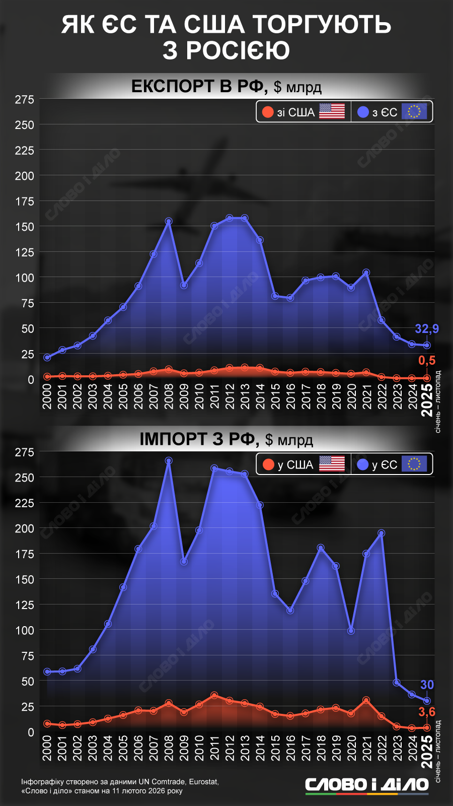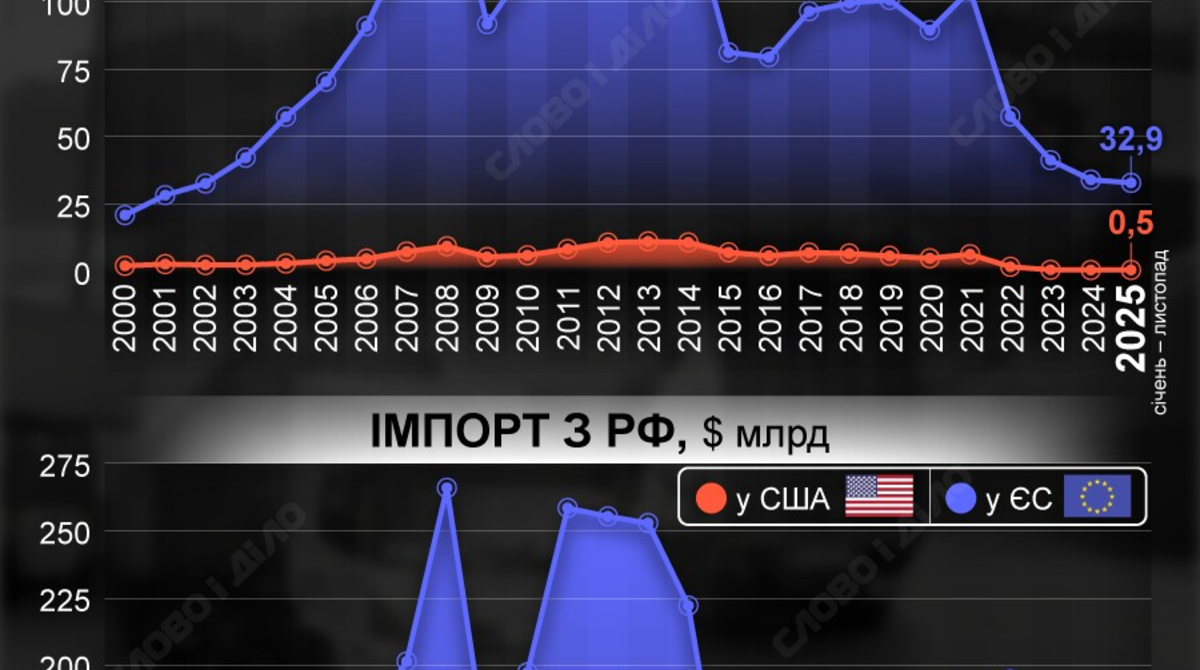 Несмотря на громкие заявления, Европа и Соединенные Штаты не остановили в полной мере торговлю с россией во время полномасштабной войны против Украины. США рекордно сократили импорт из рф за последние два года, торговые связи ЕС с россией – до сих пор оцениваются в десятки миллионов долларов. Как менялся объем торговли между США и россией с 2000 по 2025 год – на инфографике.