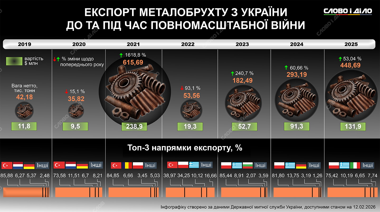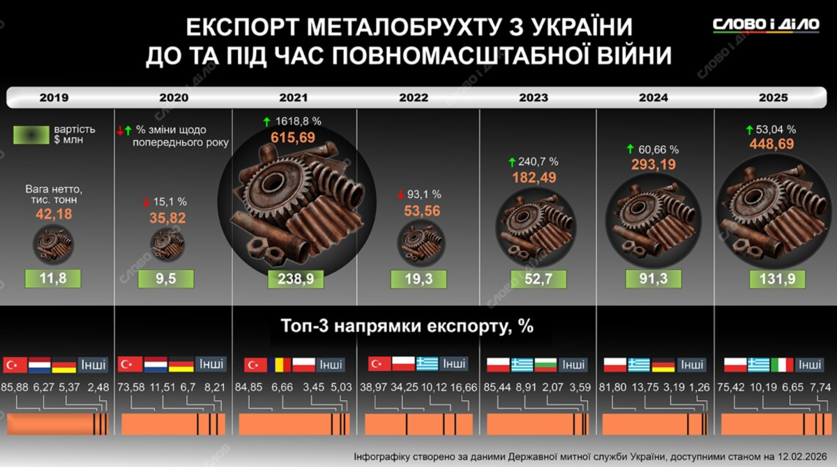 Экспорт украинского металлолома достиг максимума за годы полномасштабной войны. В прошлом году Украина продала другим странам более 448 тысяч тонн вторичного сырья. Это на 53% больше, чем в 2024-м и самый большой объем за последние четыре года. Подробнее о том, сколько металлолома Украина экспортировала до и во время полномасштабной войны и кто был основными покупателями – на инфографике.