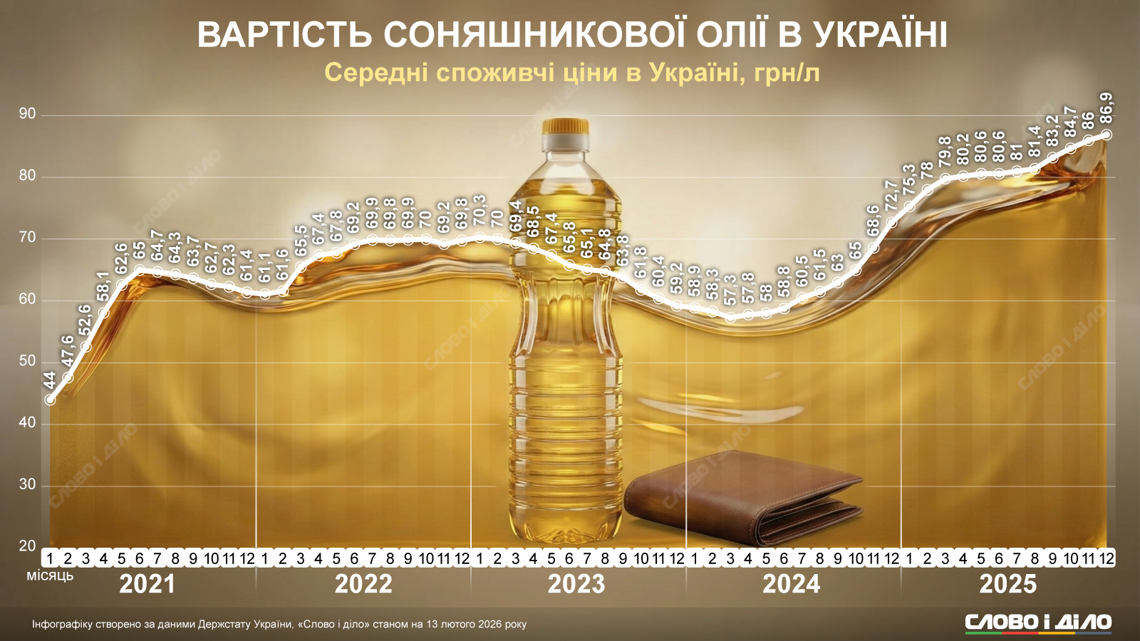 В начале прошлого года, по данным Госстата, литр растительного масла в среднем продавали за 75,3 грн. Однако в течение года цена росла и в декабре уже достигла в среднем 86,9 грн за литр. В 2025 году украинским производителям удалось продать другим странам 4,4 млн тонн масла, примерно столько же, как в первый год вторжения. Стоимость экспорта в 2025 году составила 5,2 млрд долларов.