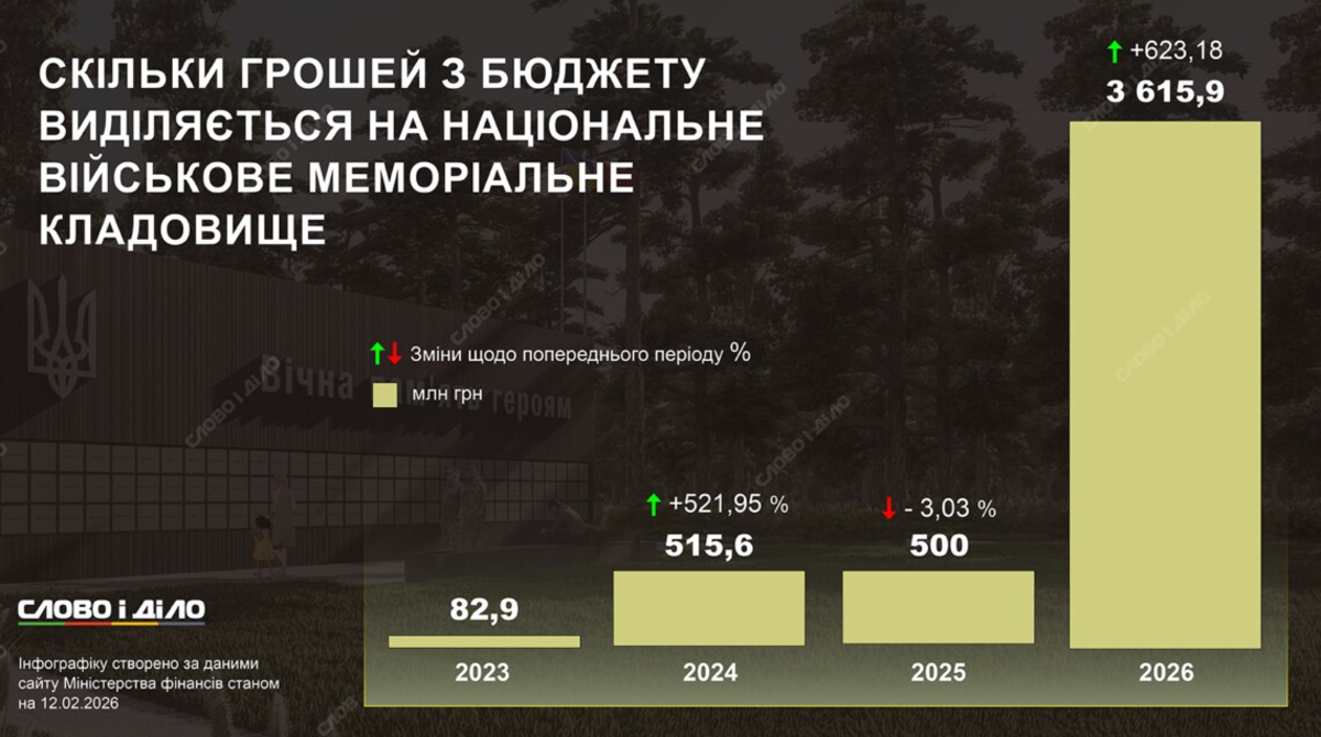 В 2026 году на достройку Национального военного мемориального кладбища в государственном бюджете заложили более 3,6 млрд гривен. Это гораздо больше, чем суммарно за все три предыдущих года большой войны. На инфографике – как менялись расходы на создание и содержание Национального военного мемориального кладбища с 2023 по 2025 год и бюджет на 2026-й.
