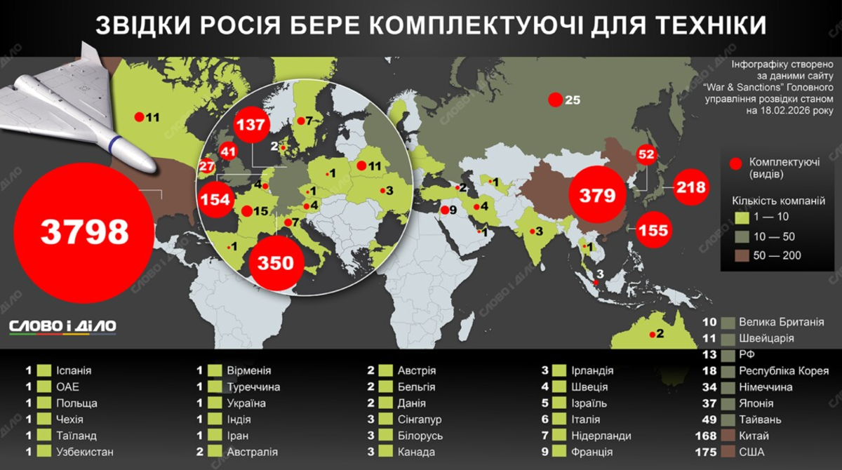 Больше всего деталей в рф попадает из США, которые, кстати, считаются союзником Украины и принимают непосредственное участие в мирных переговорах по завершению войны. В частности, ГУР идентифицировало 3798 видов комплектующих от 175 компаний США.