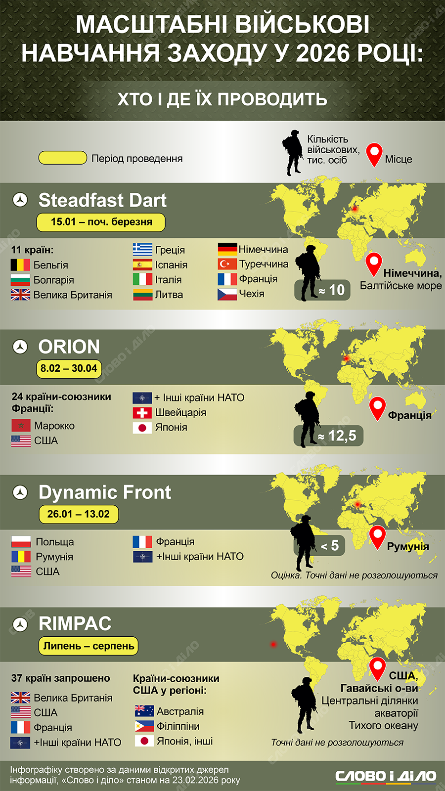 Страны мира продолжают не только наращивать количество своей армии, но и совершенствовать ее навыки. На 2026 год запланировано по меньшей мере четыре масштабных военных учения с участием государств-членов НАТО – включая маневры Steadfast Dart, которые продлятся на побережье Балтийского моря до марта. Однако общее количество маневров в течение года может возрасти. Какие страны, когда и где уже запланировали учение своих армий в текущем году – на инфографике «Слово и дело».