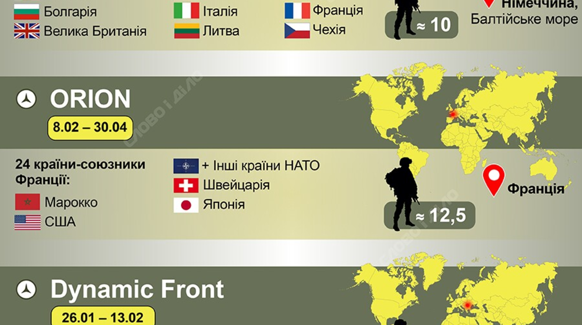 Во Франции 8 февраля стартовали масштабные военные учения ORION-26. Маневры начались с высадки морского десанта и техники в Бретани. В течение трех месяцев (до 30 апреля) не менее 12 500 французских солдат и партнеров из 24 стран будут учиться по сценарию, напоминающему начало вторжения рф в Украину. На разных этапах в учениях примут участие страны, являющиеся союзниками Франции, включая Японию, Швейцарию, Марокко и Соединенные Штаты.