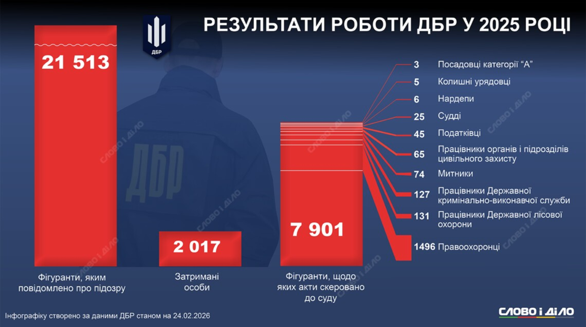 Государственное бюро расследований отчиталось о результатах работы за прошлый год. Всего в течение 2025 года было объявлено 21 513 подозрений. До суда дошли более трети всех дел. Среди фигурантов производств – нардепы, судьи, таможенники, налоговики, бывшие чиновники, но больше всего – правоохранителей. Подробнее – на инфографике.