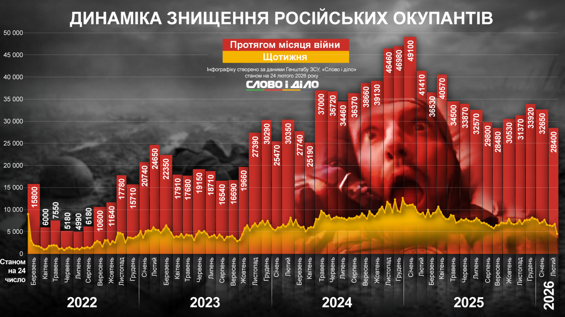 В январе 2026 года российская армия потеряла 32 650 тысяч своих солдат, в течение февраля – 28 400.