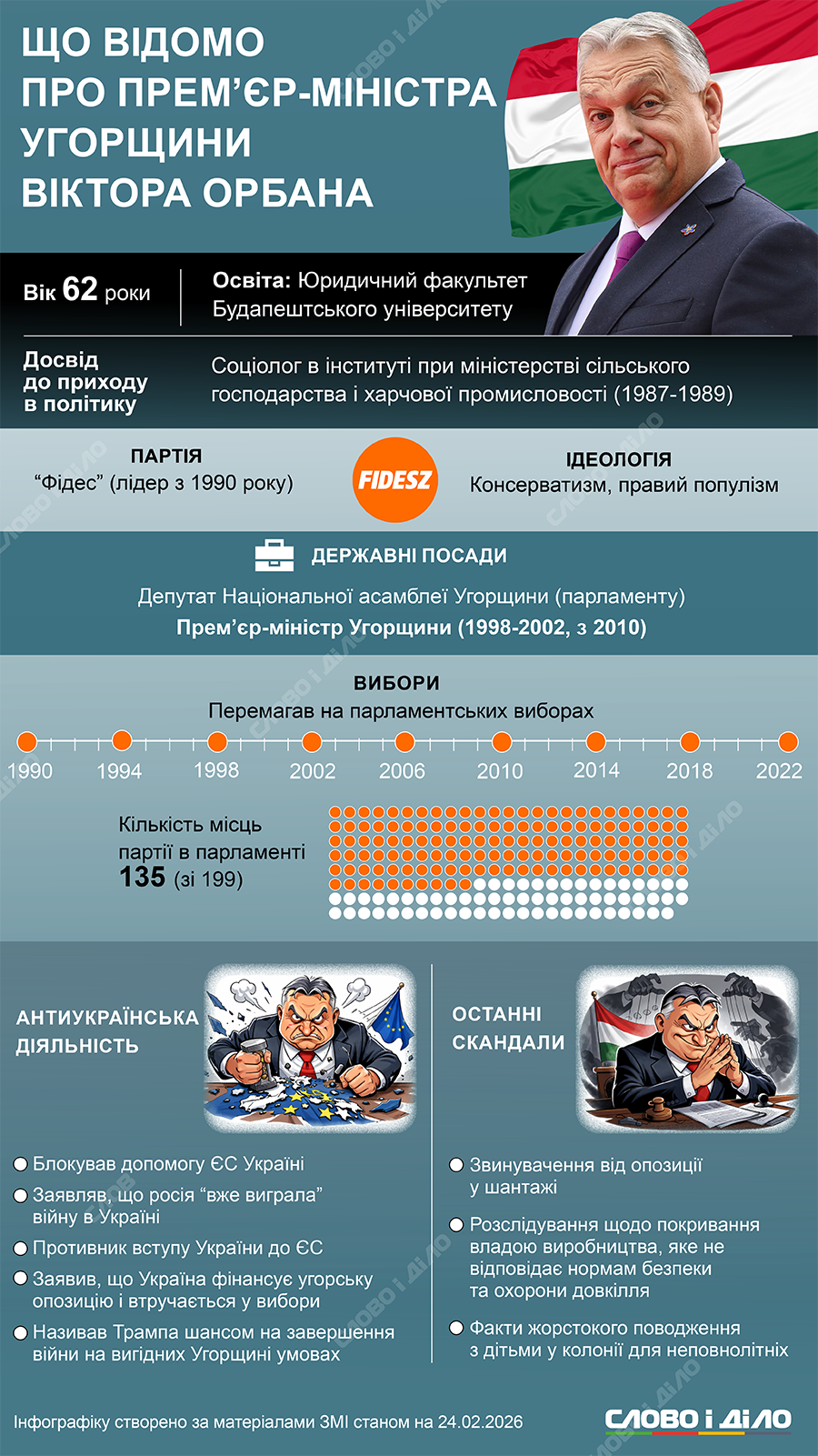 В отношениях Украины и Венгрии разворачивается новый виток напряжения. Будапешт до сих пор блокирует решение Евросоюза о 90 млрд евро для Киева после приостановки транзита российской нефти через украинскую территорию по нефтепроводу «Дружба». Вместе с тем скандальный венгерский премьер Виктор Орбан даже угрожал ограничить и экспорт электричества, однако его слова не подтвердил глава венгерского МИД Петер Сийярто. До этого Орбан неоднократно блокировал санкции ЕС против Украины, а также транслировал тезисы российской пропаганды о якобы очевидной победе Кремля в войне. Однако не исключено, что сейчас длятся последние его месяцы у власти – перед выборами в апреле оппозиционная партия «Тиса» сохраняет превосходство над партией Орбана. Что известно об антиукраинском скандальном премьере Венгрии Викторе Орбане – на инфографике.