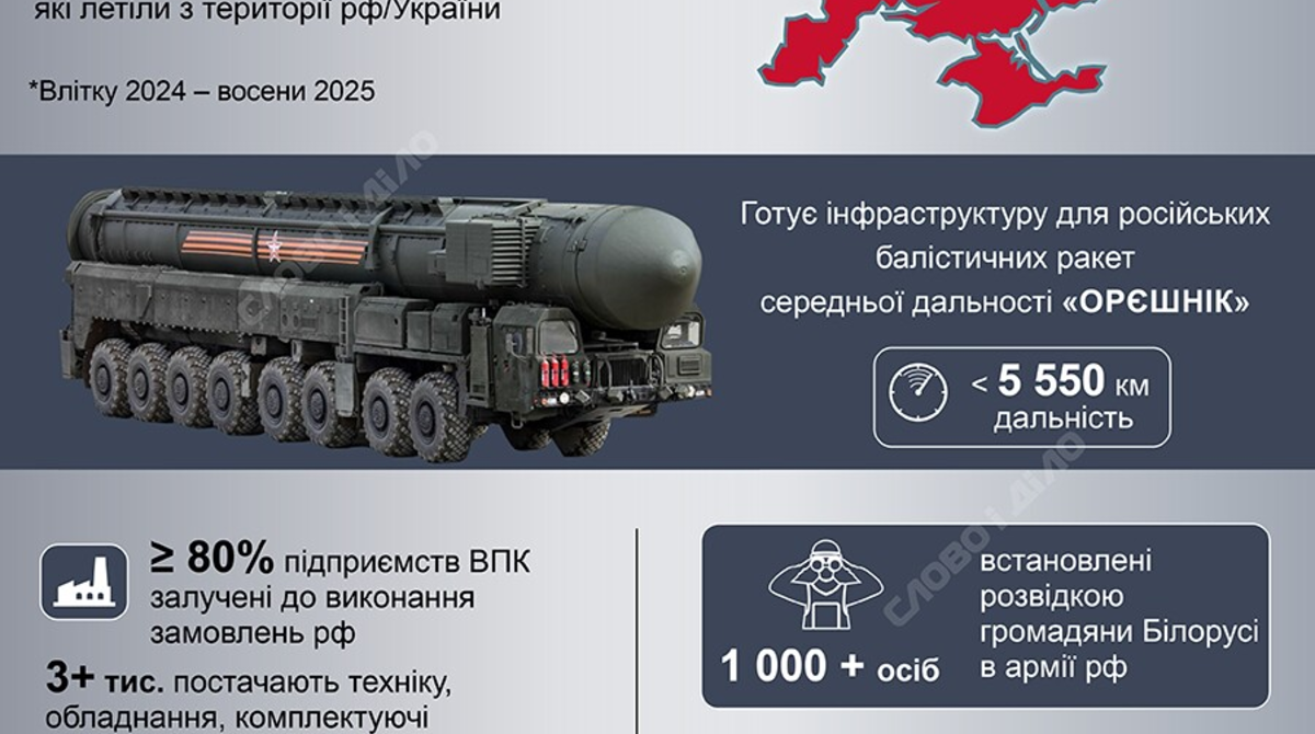 Помимо этого, начиная с прошлого года, Беларусь развивает инфраструктуру для размещения на своей территории российских баллистических ракет средней дальности «Орешник», которыми так любит угрожать российский диктатор путин. Отметим, дальность этих ракет – до 5500 км.