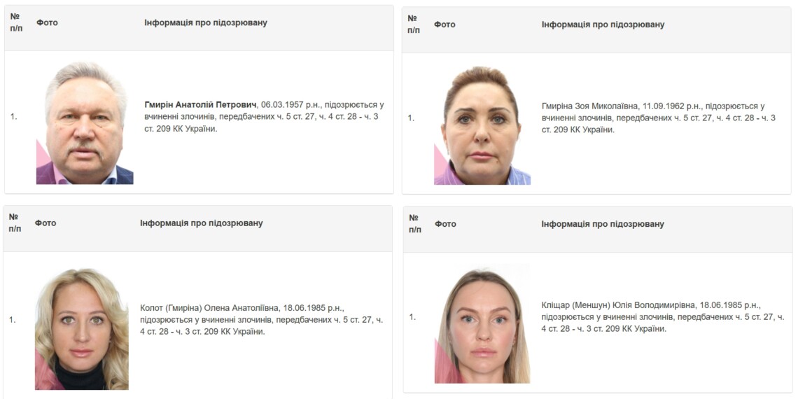 «НАБУ разыскивает Клищар (Меншун) Юлию Владимировну, подозреваемую в уголовном производстве в совершении уголовного правонарушения, предусмотренного ч. 5 ст. 27, ч. 4 ст. 28 – ч. 3 ст. 209 УК Украины. НАБУ разыскивает Гмырина Анатолия Петровича, подозреваемого в уголовном производстве в совершении уголовного правонарушения, предусмотренного ч. 5 ст. 27, ч. 4 ст. 28 – ч. 3 ст. 209 УК Украины. НАБУ разыскивает Гмырину Зою Николаевной, подозреваемую в уголовном производстве в совершении уголовного правонарушения, предусмотренного ч. 5 ст. 27, ч. 4 ст. 28 – ч. 3 ст. 209 УК Украины. НАБУ разыскивает Колот (Гмирину) Елену Анатольевну, подозреваемую в уголовном производстве в совершении уголовного правонарушения, предусмотренного ч. 5 ст. 27, ч. 4 ст. 28 – ч. 3 ст. 209 УК Украины», – информируют в НАБУ.