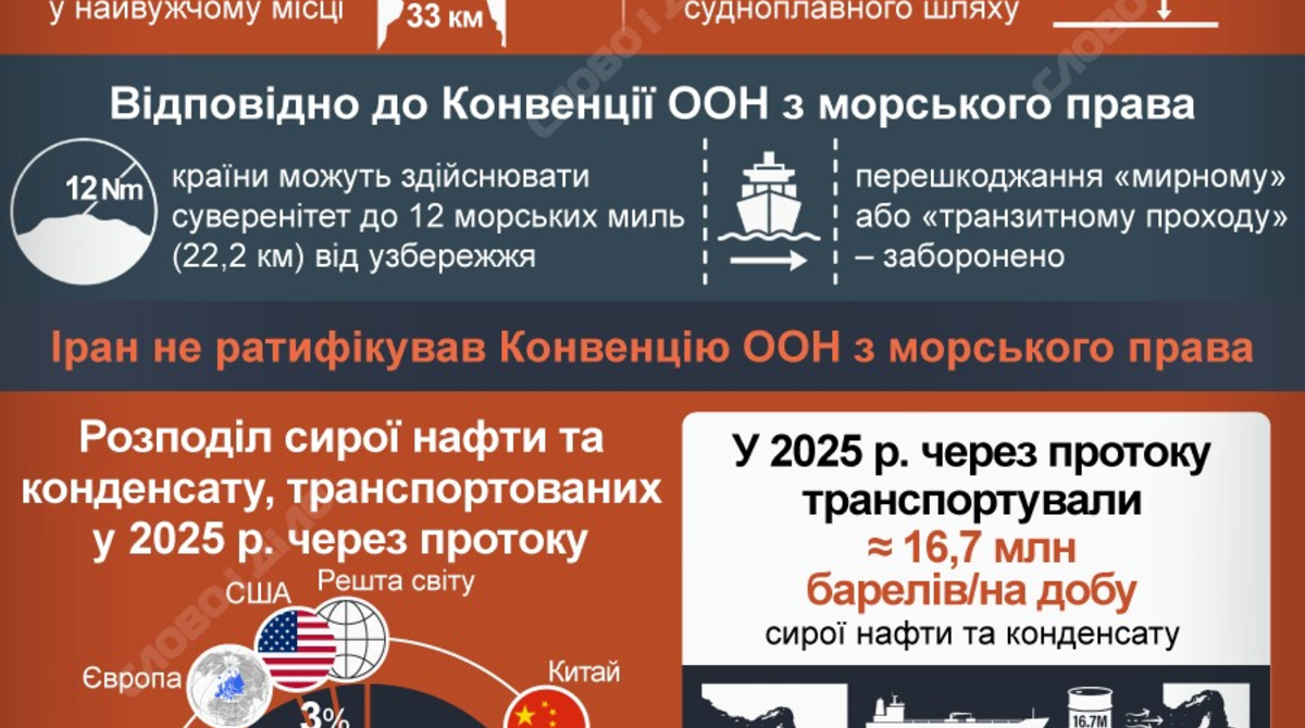 Ормузский пролив обеспечивает треть мировой морской торговли нефтью, а также около 20% мировой морской торговли сжиженным природным газом. Ограничение движения нефтяных танкеров из-за нее после атаки США и Израиля на Иран уже повлекло за собой обвалы на фондовых рынках, а также рост цен на нефть и автогаз. Пока несущественно, но уже удорожало топливо на украинских АЗС. И хотя США не подтверждают заявления Ирана о полном закрытии Ормузского пролива, свою обеспокоенность уже выразил ключевой торговый союзник Ирана Китай, транспортирующий по этому пути наибольший объем сырой нефти. Подробнее об Ормузском проливе, который является важнейшей транспортной артерией для поставки нефти из стран Ближнего Востока – на инфографике.