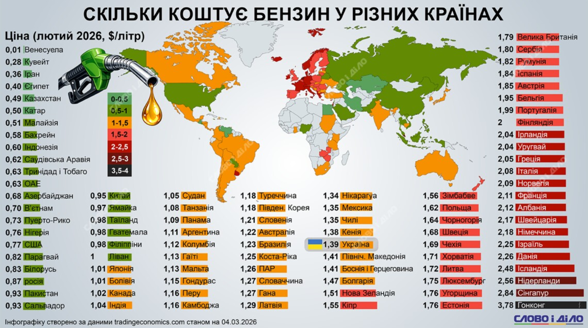 В Украине литр бензина в среднем стоит 1,39 доллара. Эксперты предупреждали, что цены на АЗС могут отреагировать на войну в Иране, вслед за подорожанием на мировых рынках нефти и автогаза. В соседней Польше стоимость литра бензина составляет 1,62 доллара, Швеции – 1,68 доллара, в Литве – 1,72 доллара, в Венгрии – 1,76 доллара, в Испании – 1,84 доллара, Бельгии – 1,95 доллара, Португалии – 1,99.