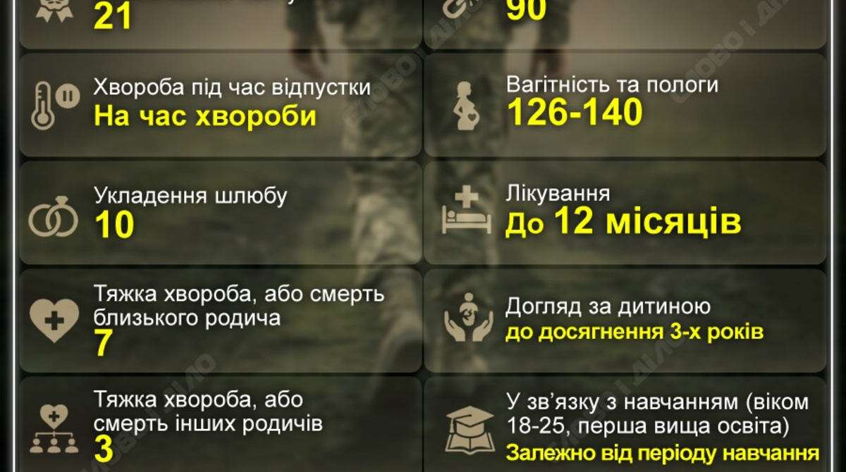 Законом утверждены еще несколько видов отпусков, которые предоставляются во время действия военного положения. Причины предоставления отпуска следующие:
