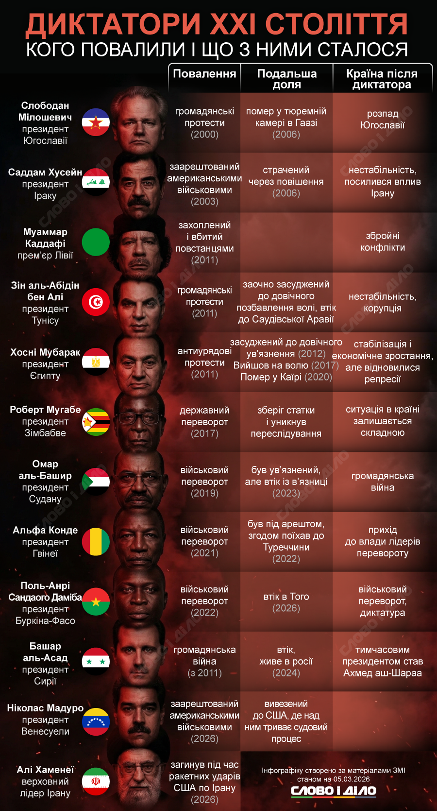 Верховный лидер Ирана Али Хаменеи, который на днях погиб во время ракетных ударов Израиля и США по Тегерану, стал как минимум двенадцатым диктатором этого века, режим которого был свергнут. До него были свергнуты многолетние режимы Башара Асада в Сирии и Николаса Мадуро в Венесуэле. Что известно о других диктаторах XXI века, которых свергли во время протестов, убили или арестовали во время военных действий – на инфографике.