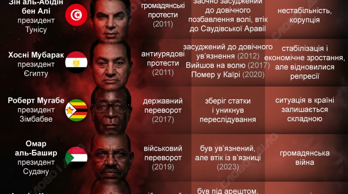 Суданский диктатор Омар аль-Башир (президент в 1989–2019 годах) правил страной после военного переворота, захватив власть. Однако его самого свергли во время переворота в 2019 году. Диктатора заключили в тюрьму, но он сбежал из нее в 2023 году. В Судане после его свержения началась гражданская война.