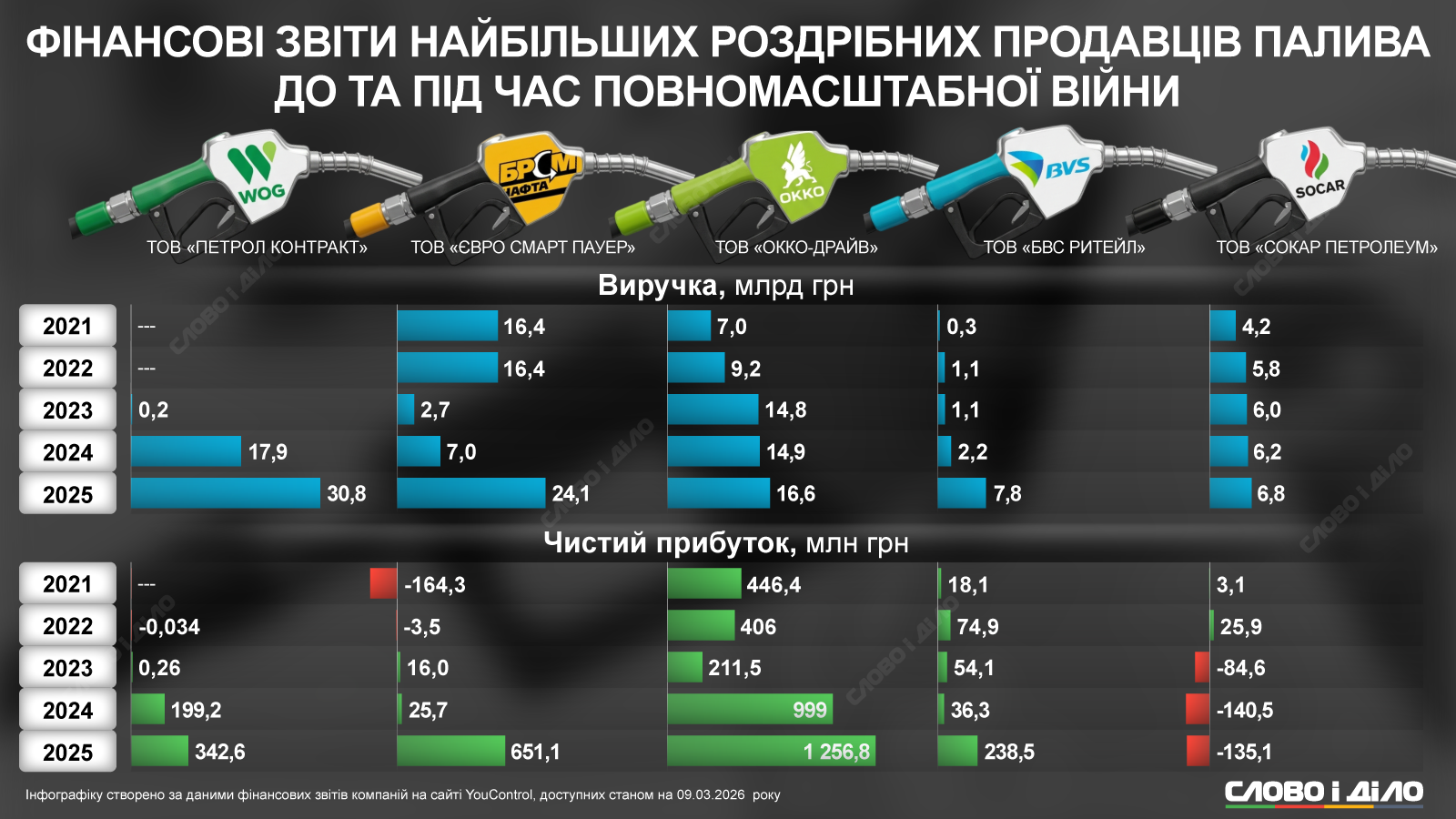 Мы проанализировали финансовые отчеты крупнейших розничных компаний сетей АЗС – WOG, БРСМ-Нафта, ОККО, BVS, SOCAR с 2021 по 2025 годы, предоставленные компанией YouControl.