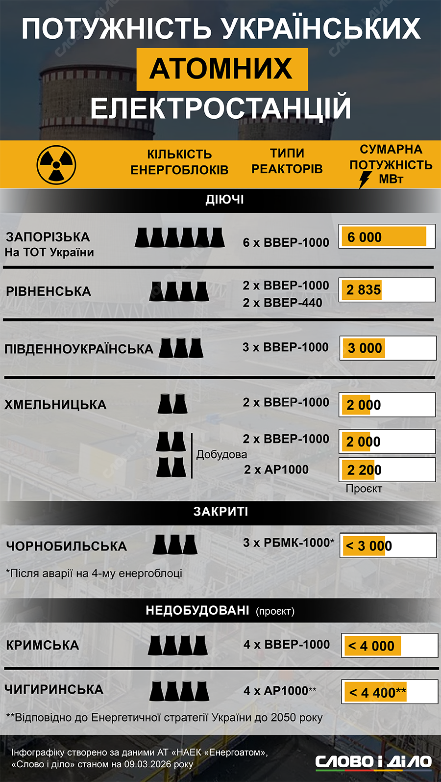 Оккупированная россиянами Запорожская АЭС имеет наибольшую мощность – по сравнению с Ровненской, Южноукраинской и Хмельницкой. Она могла бы производить значительный объем электроэнергии для нужд Украины, однако все энергоблоки ЗАЭС в настоящее время находятся в состоянии «холодной остановки» с заглушенным реактором. Подробнее о характеристиках украинских АЭС – на инфографике.