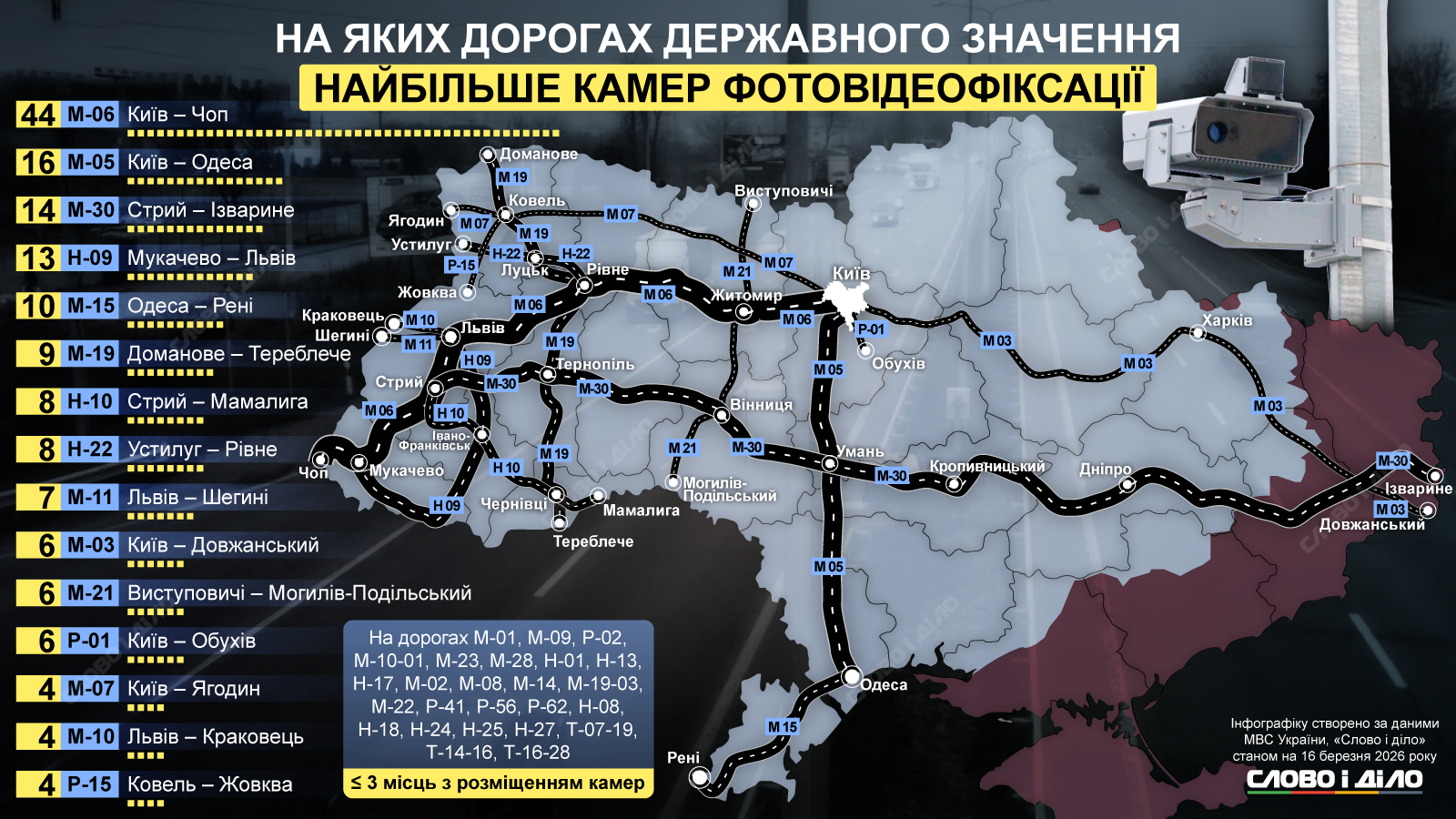 По 6 камер установлено на трассах Р-01 Киев – Обухов, М-03 Киев – Харьков – Должанский, М-21 Выступовичи – Житомир – Могилев – Подольский. На магистрали М-11 Львов – Шегини – 7 локаций с камерами. По 8 устройств видеонаблюдения расположены на дорогах Н-10 Стрый – Мамалыга и Н-22 Устилуг – Луцк – Ровно. На М-19, ведущей из населенного пункта Доманово в Тереблече, 9 камер.