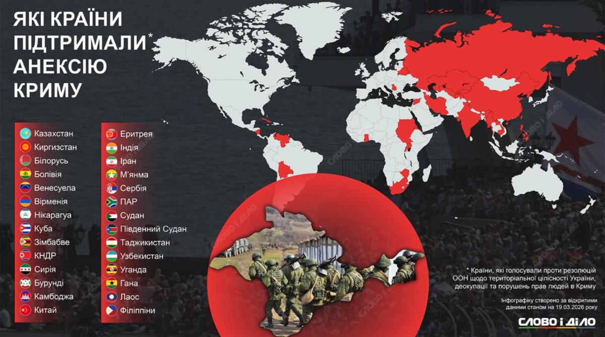 Несмотря на то, что Генеральная Ассамблея ООН с самого начала российской агрессии приняла ряд ключевых резолюций, касающихся поддержки Украины и её суверенитета, около 30 стран продолжают открыто потакать стране-агрессору России, в частности – при голосовании по Крыму. Среди таких государств – союзник Кремля Беларусь, тоталитарная КНДР, воюющие Иран и Сирия, а также ряд африканских слаборазвитых стран. Полный перечень сторонников аннексии Крыма – на инфографике.