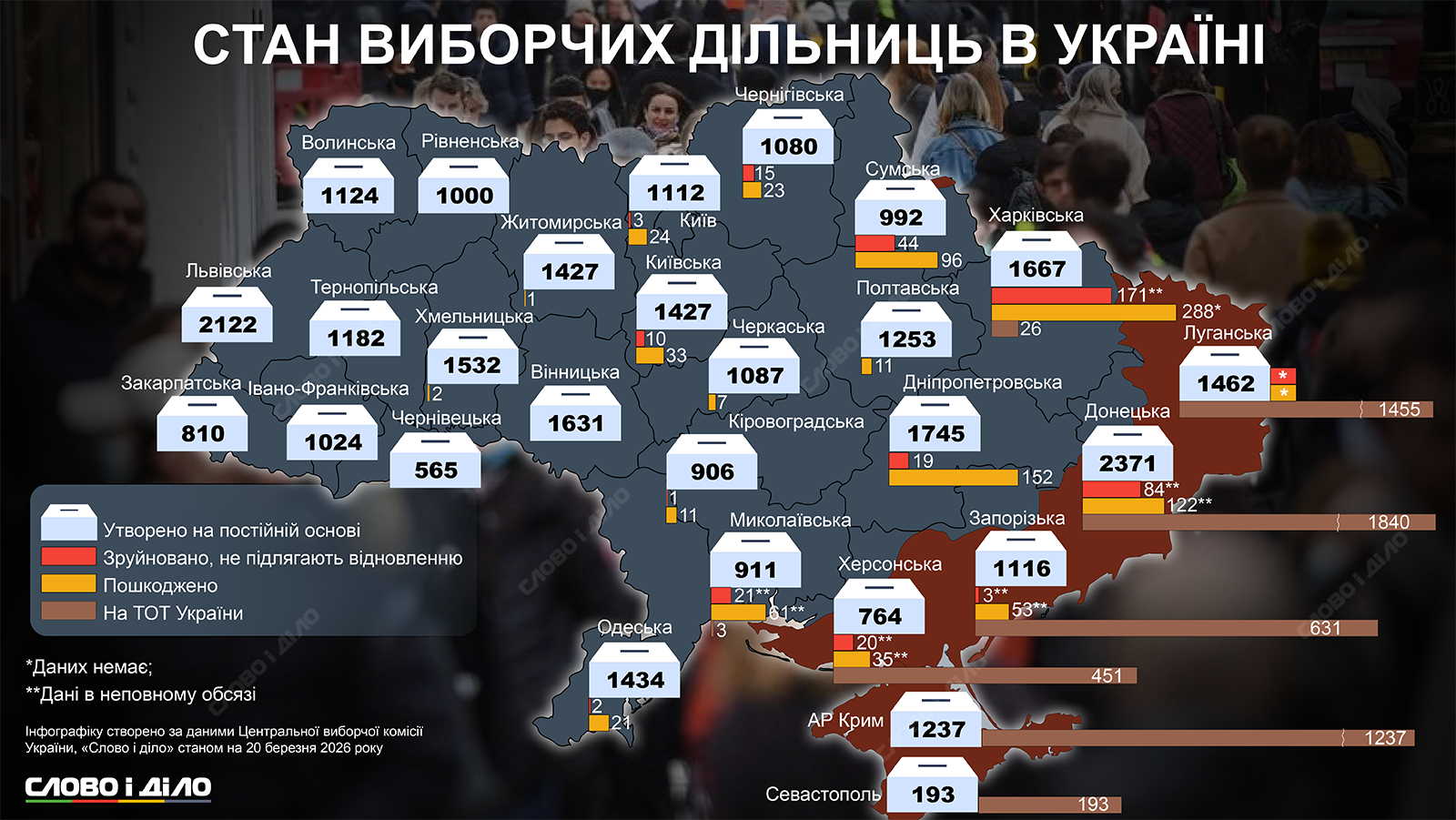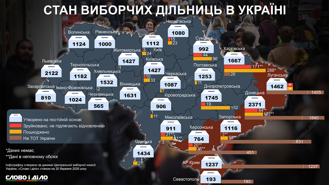 В Украине по состоянию на март текущего года из 33 174 избирательных участков полностью разрушены почти 400. Больше всего таких участков в Харьковской, Донецкой и Сумской областях — на них граждане проголосовать не смогут. И пока сам вопрос о проведении президентских выборов в 2026 году остается открытым из-за войны, аналитики «Слово и дело» проверили, сколько избирательных участков в Украине потенциально готовы к возможным выборам, сколько из них повреждены, разрушены и сколько осталось на оккупированных территориях.