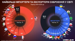Основные продавцы и покупатели оружия на мировом рынкеСША экспортируют почти половину современного оружия в мире, а главным покупателем в 2024–2025 годах стала Украина.