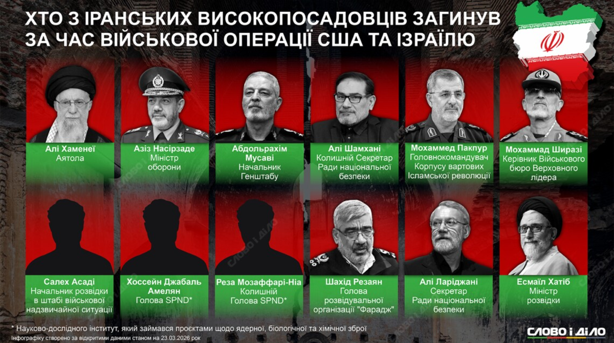 В ходе военной операции США и Израиля против Ирана, продолжающейся уже более трёх недель, погибли по меньшей мере 12 высокопоставленных лиц, в числе которых верховный лидер Али Хаменеи и высшее военное руководство. Подробнее – на инфографике «Слово и дело».