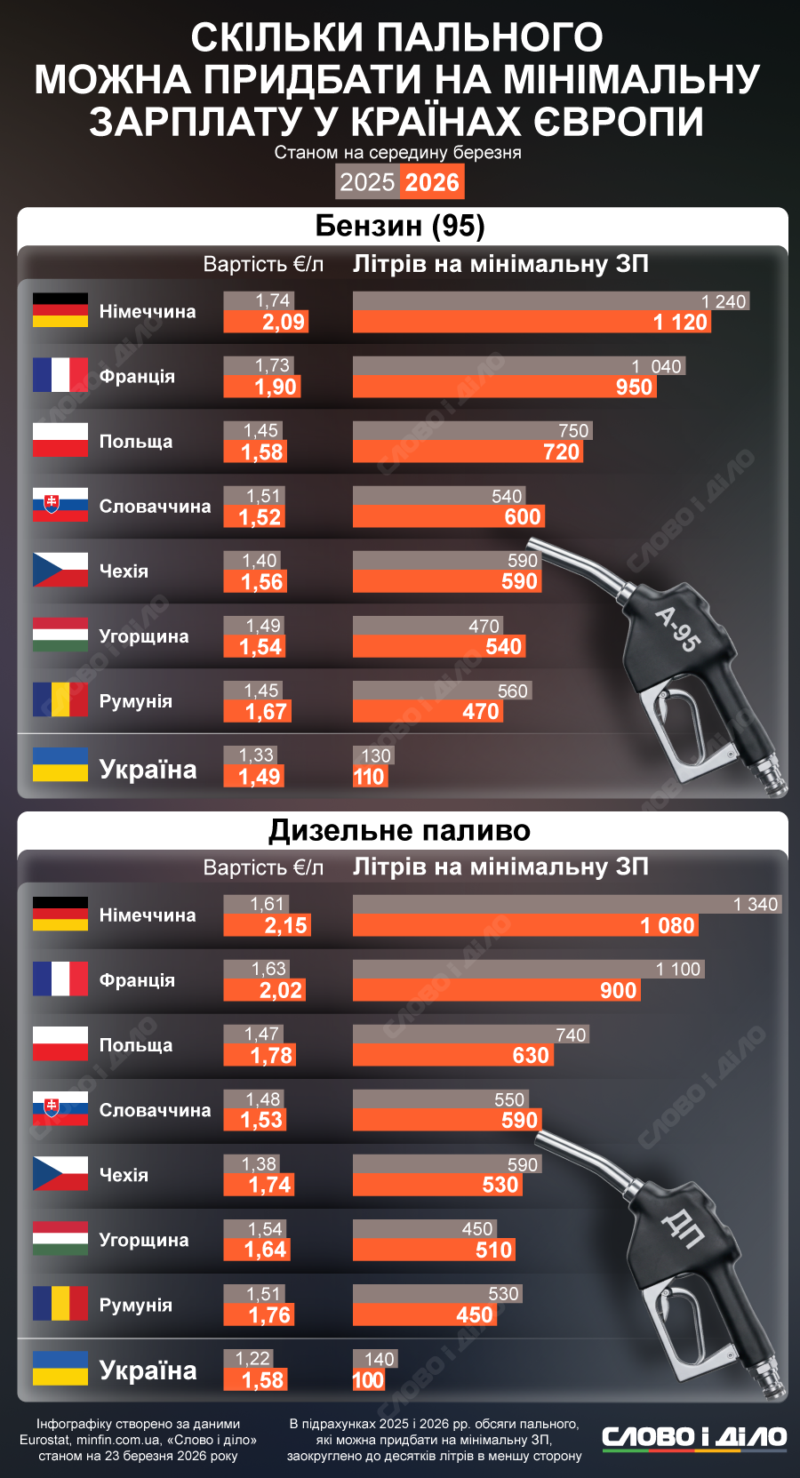 Меньше всего дизельного топлива удастся купить на минимальную зарплату в Украине – 100 литров. Средняя стоимость этого вида топлива в марте 2026 года – 80 грн за литр (1,58 евро). Год назад дизель в Украине стоил 55 грн за литр (1,22 евро) и на минимальную зарплату можно было приобрести 140 литров.