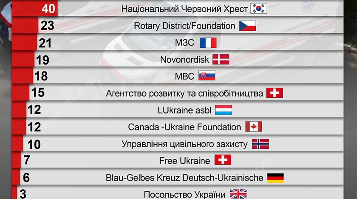 До десяти машин скорой помощи передавали в разные годы благотворительные организации из Швейцарии, Германии, США, Швеции, Дании и Польши. К благотворительной передаче машин скорой помощи для МОЗ Украины присоединились правительства Сербии и Израиля, а также МВД Финляндии, МИД Эстонии, посольства Украины в Словении и Великобритании, а также Украинское медицинское общество Северной Америки и Агентство по чрезвычайным ситуациям Швеции.