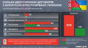 Украина разорвала треть двусторонних договоров с Беларусью за годы вторженияМежду Украиной и Беларусью продолжает действовать 199 двусторонних договоров из 315, действовавших перед началом вторжения россии. Подробнее – на инфографике.