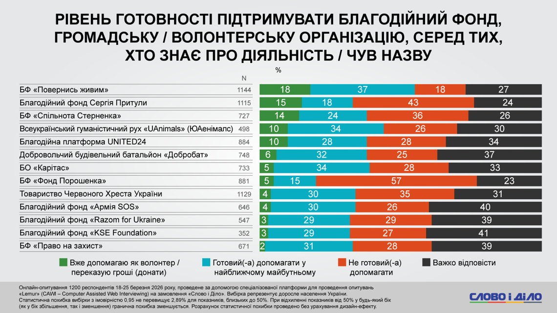 Об этом свидетельствуют данные социологического исследования, проведенного по заказу «Слово и дело» с 18 по 25 марта 2026 года методом онлайн-опроса репрезентативной выборки 1200 интернет-пользователей в возрасте 18 лет и старше по всей территории Украины, за исключением временно оккупированных территорий (статистическая погрешность – с вероятностью 0,95 не превышает 2,89%) на специализированной платформе для проведения опросов «Lemur» (CAWI – Computer Assisted Web Interviewing).