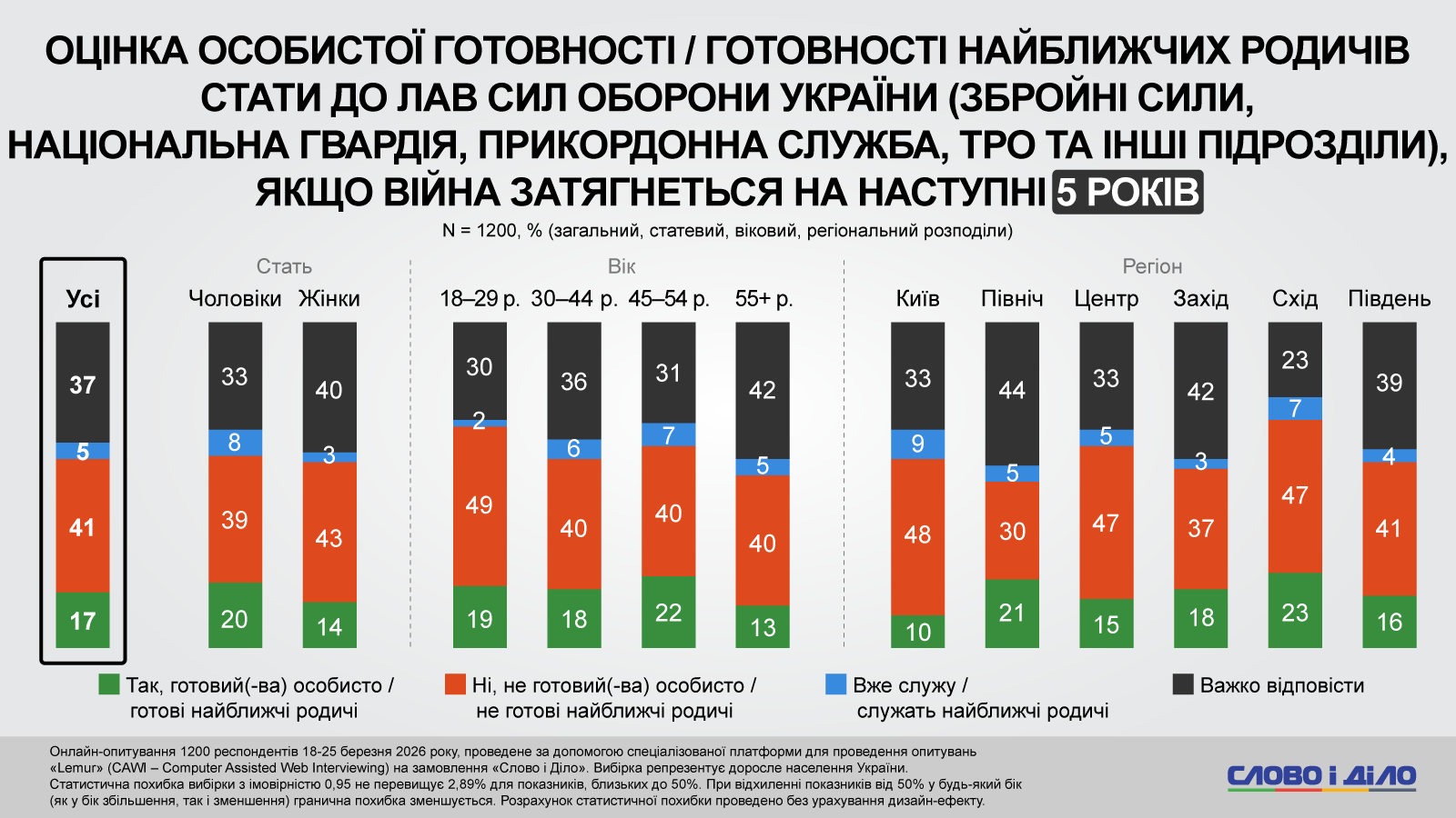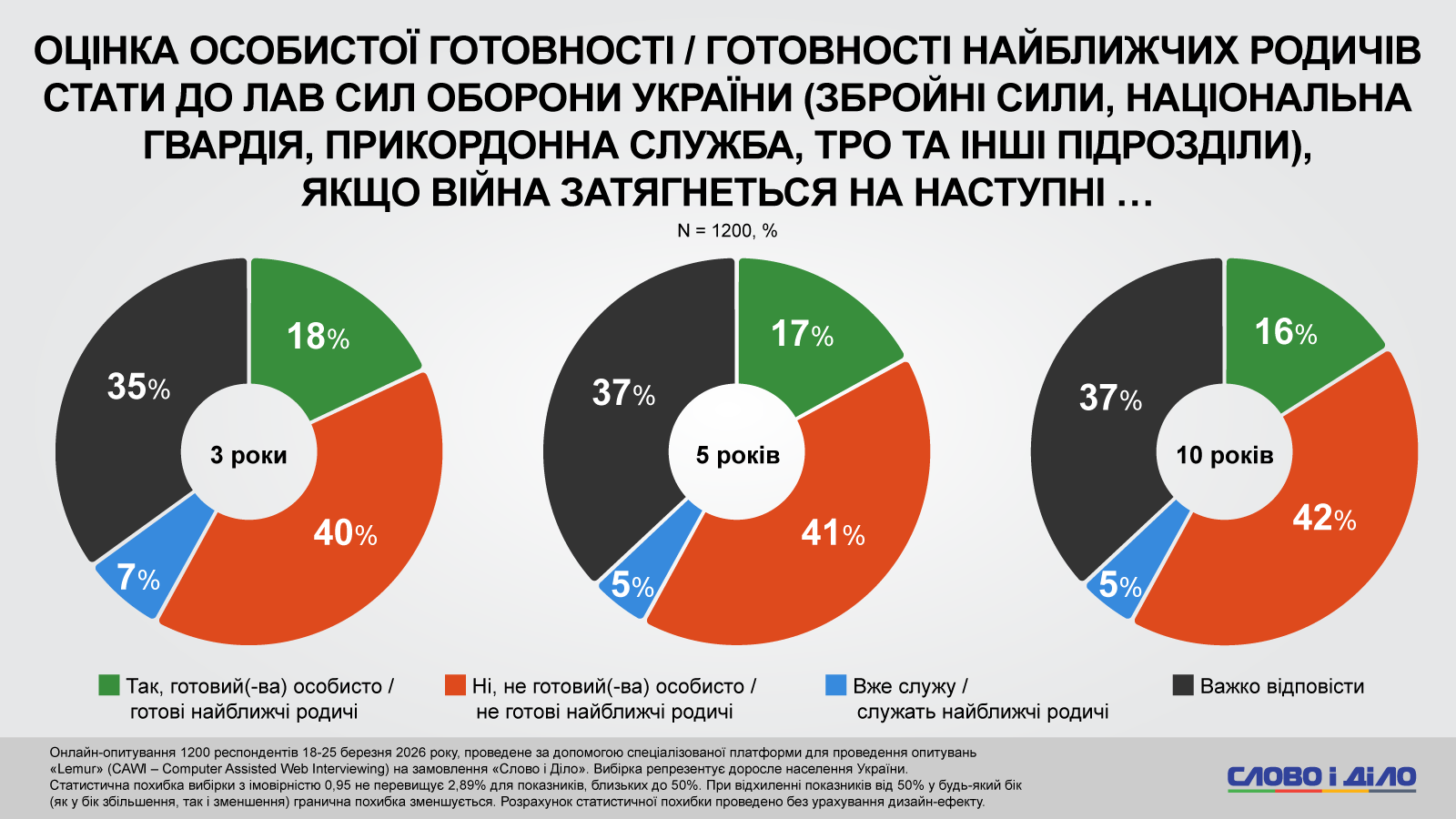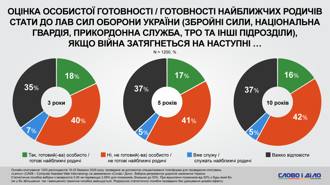 Об этом свидетельствуют данные социологического исследования, проведенного по заказу «Слово и дело» с 18 по 25 марта 2026 года методом онлайн-опроса репрезентативной выборки 1200 интернет-пользователей в возрасте 18 лет и старше по всей территории Украины, за исключением временно оккупированных территорий (статистическая погрешность – с вероятностью 0,95 не превышает 2,89%) на специализированной платформе для проведения опросов «Lemur» (CAWI – Computer Assisted Web Interviewing).