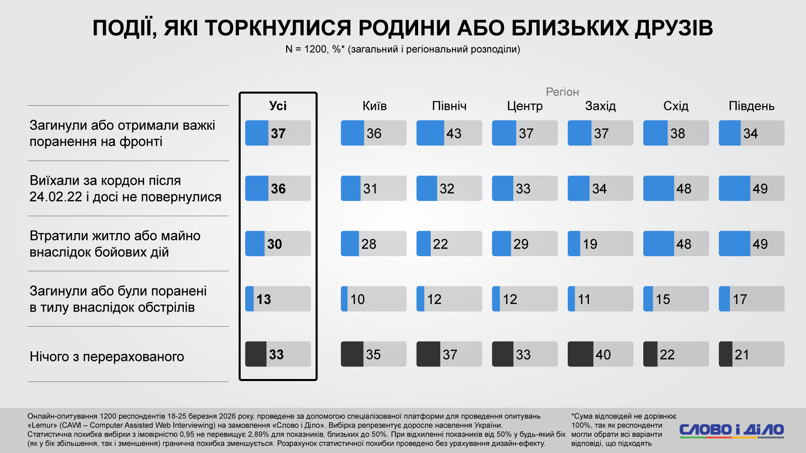 Об этом свидетельствуют данные социологического исследования, проведенного по заказу «Слово и дело» с 18 по 25 марта 2026 года методом онлайн-опроса репрезентативной выборки 1200 интернет-пользователей в возрасте 18 лет и старше по всей территории Украины, за исключением временно оккупированных территорий (статистическая погрешность – с вероятностью 0,95 не превышает 2,89%) на специализированной платформе для проведения опросов «Lemur» (CAWI – Computer Assisted Web Interviewing).