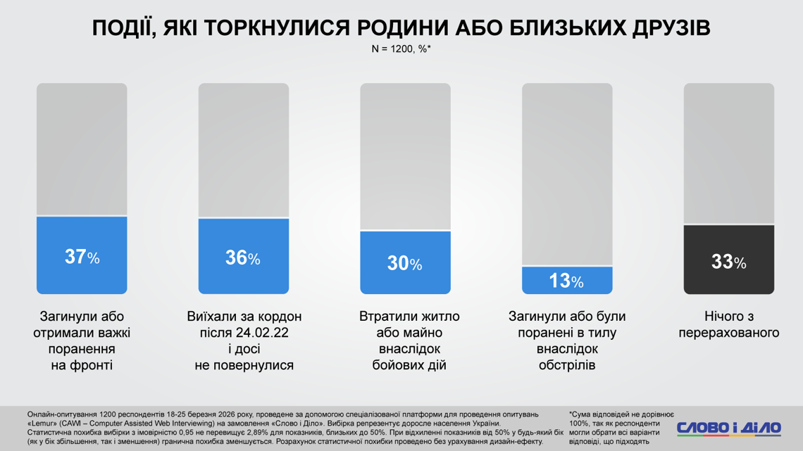 Самый высокий показатель (37%) касается гибели или тяжелых ранений близких на фронте. Это означает, что более трети украинских семей уже имеют прямой опыт боевой потери. Это формирует в обществе сверхвысокий уровень эмпатии к военным и одновременно – глубокую общую боль.