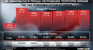 Как менялась площадь оккупированных территорий Украины во время российского вторженияКак менялась площадь оккупированных территорий Украины во время российского вторжения с момента начала аннексии Крыма и части Донбасса по 2026 год – на инфографике «Слово и дело».