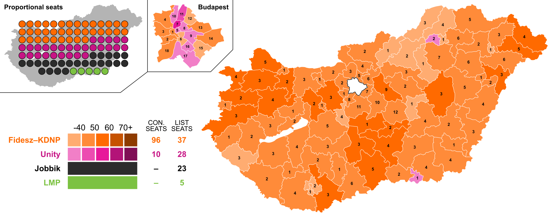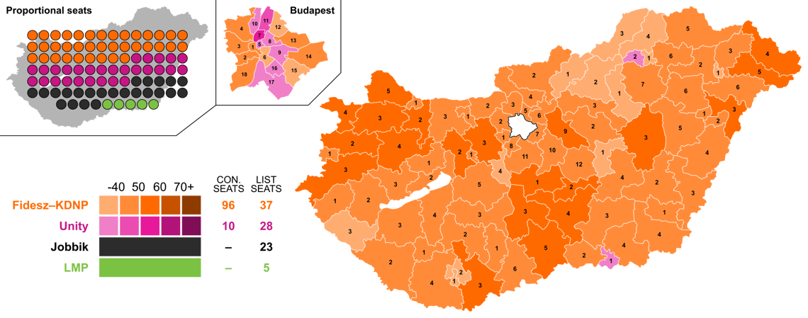 Однако ключевое изменение коснулось избирательной системы. Теперь в венгерском парламенте заседало не 386, а 199 депутатов, 106 из которых избираются по одномандатным мажоритарным округам. Причем только в один тур с относительным большинством. То есть, можно набрать хоть тридцать, хоть двадцать процентов, лишь бы первое место – и место в парламенте за вами.