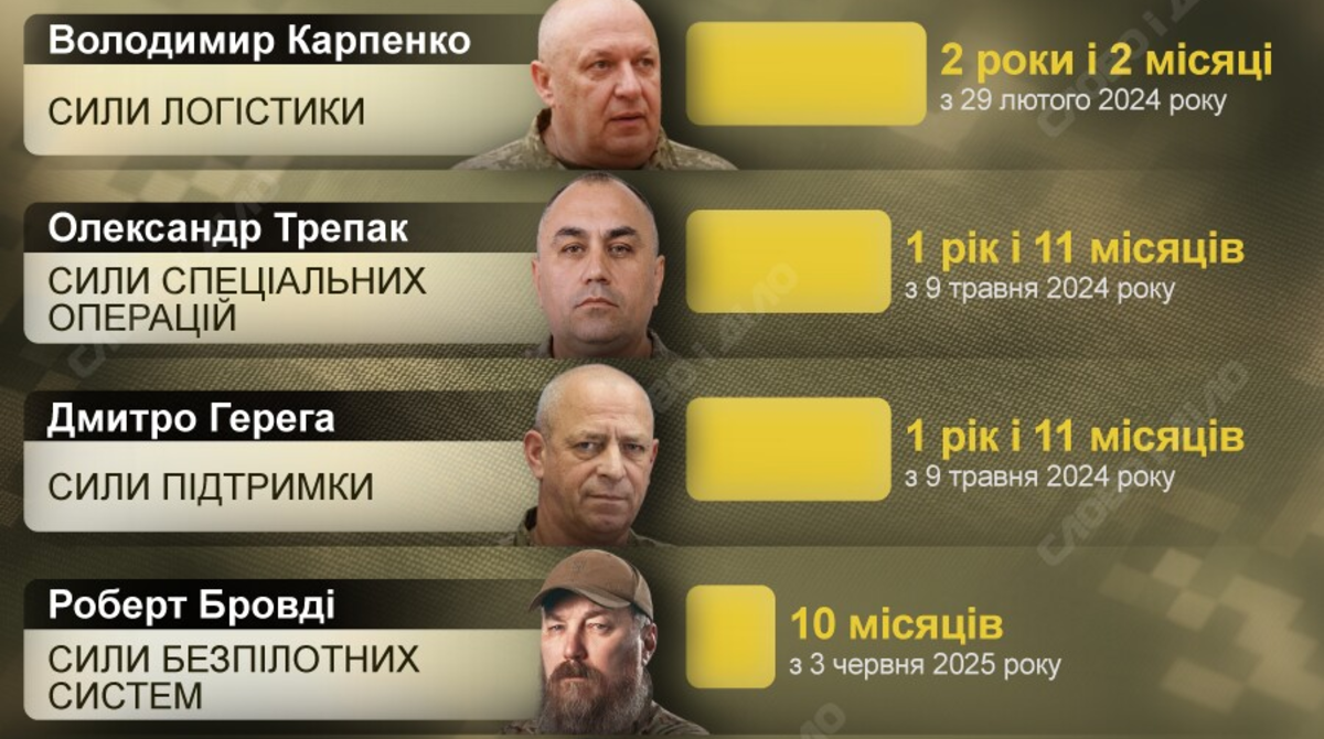 Одинаковый срок на своих должностях пребывают командующий Силами территориальной обороны Игорь Плахута и командующий Силами логистики Владимир Карпенко – 2 года и 2 месяца (с февраля 2024 года). Также одинаковый промежуток времени в креслах военных руководителей провели командующий Силами специальных операций Александр Трепак и командующий Силами поддержки Дмитрий Герега – с мая 2024 года.