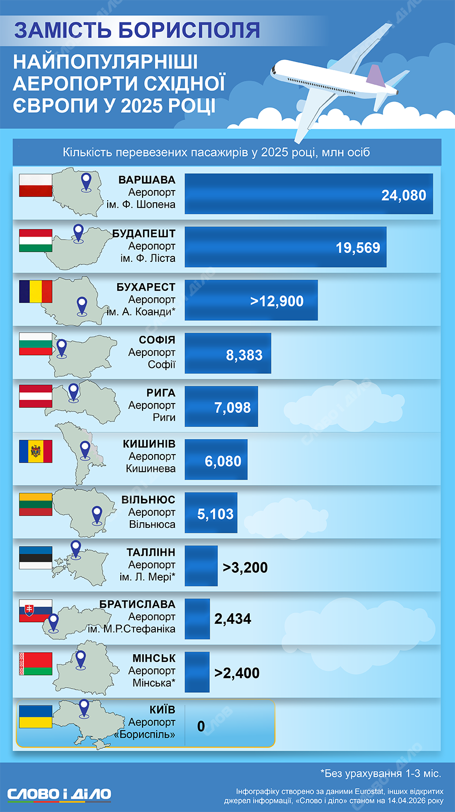 Аэропорт имени Леннарта Мери в Таллине, Эстония, принял за 2025 год как минимум 3 миллиона пассажиров, а аэропорт имени Милана Стефаника в Братиславе, Словакия – 2 миллиона 434 тысячи человек.