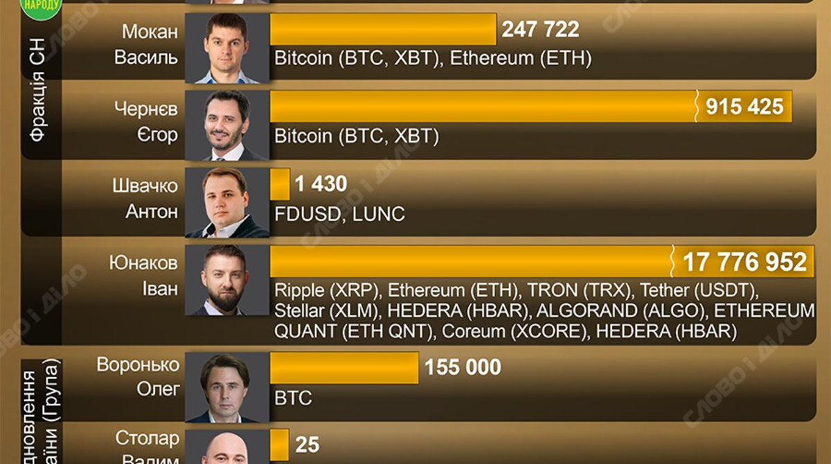 Народный депутат от партии «Слуга народа» Иван Юнаков задекларировал криптовалюту на самую большую сумму среди других парламентариев — 17,7 млн грн. В целом фракция «Слуга народа» лидирует по количеству народных избранников, имеющих сбережения в криптовалюте. «Слово и дело» проанализировало декларации народных депутатов и предлагает на инфографике посмотреть, кто еще из депутатов Верховной Рады владеет криптовалютой и на какую сумму.