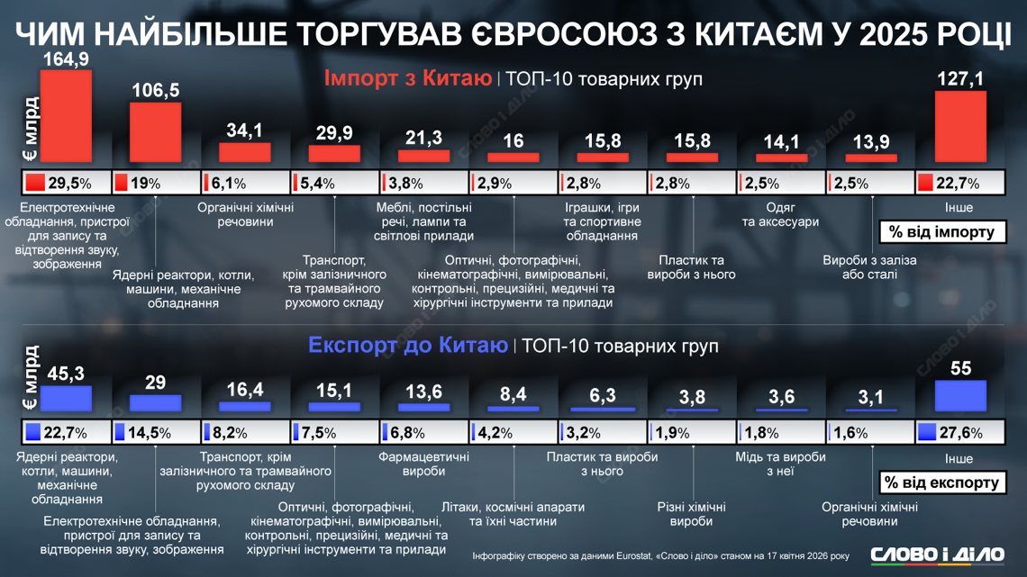 В случае ЕС это свидетельствует о большом спросе в ЕС на китайскую продукцию и высокой покупательной способности европейцев. И наоборот: для Китая европейские товары являются относительно более дорогими. О каких именно товарах и продукции идёт речь – показывает статистика за 2025 год: