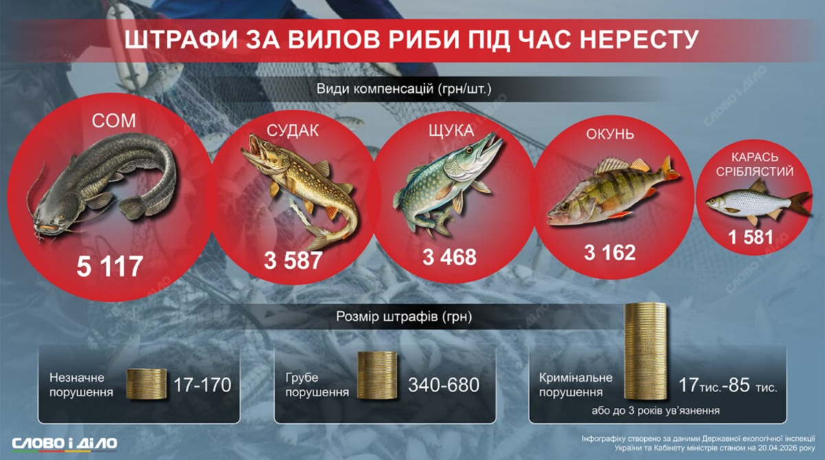 Вся рыба, выловленная с нарушением этих правил, подлежит поштучной компенсации. За каждого незаконно пойманного карася серебристого придётся заплатить компенсацию в размере 1581 гривны; окуня – 3162 гривны; судака – 3587 гривен; щуку – 3468 гривен. Наибольший ущерб оценивается от незаконного вылова сомов – по 5117 гривен за особь.