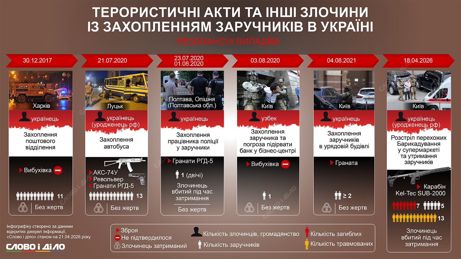 Ранее «Слово и дело» рассказывало о том, сколько полицейских погибло в тылу за четыре года полномасштабной войны. Также после луцкого теракта 2020 года «Слово и дело» выпустило инфографику о схожих, но менее резонансных случаях захвата заложников.