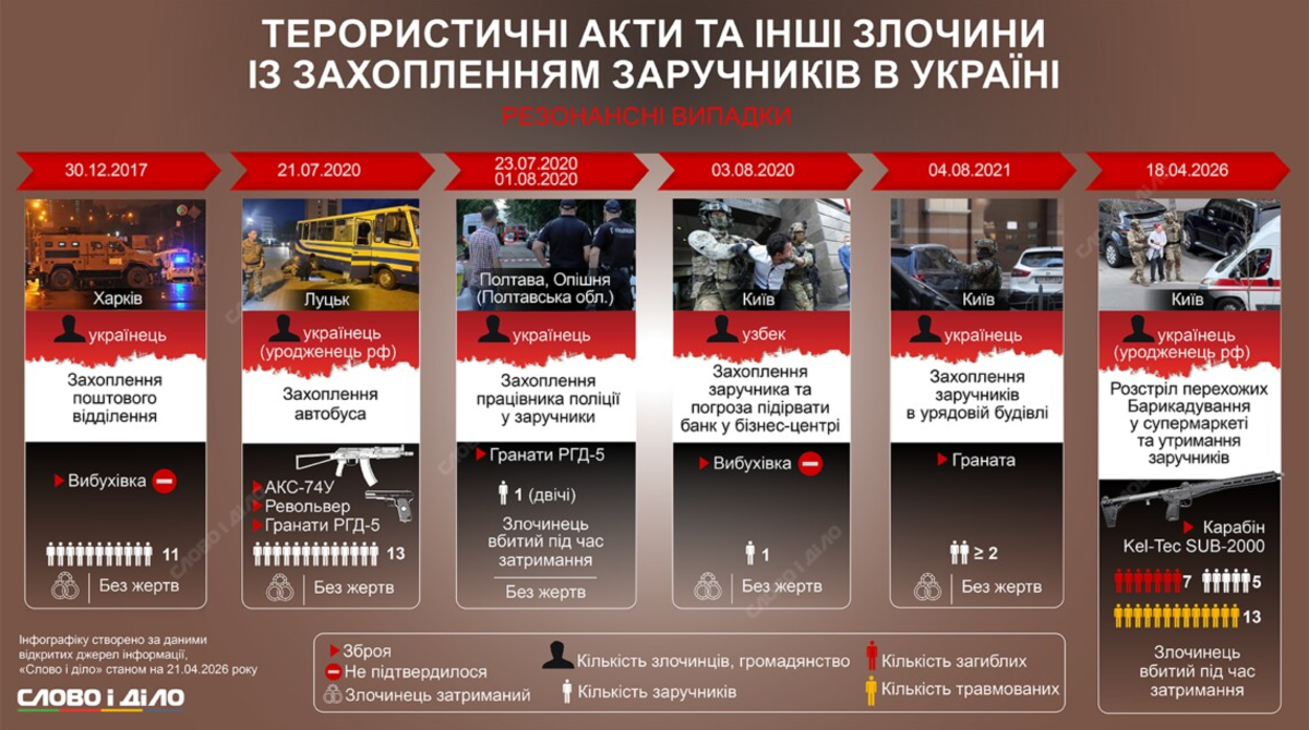 После резонансного теракта в Киеве, в результате которого погибло семь человек, в Украине разгорелись дискуссии об эффективности правоохранительных органов в подобных случаях. Руководитель Департамента патрульной полиции Украины, генерал Евгений Жуков, подал в отставку, а президент Владимир Зеленский анонсировал кадровые изменения в МВД. Напряжённости также добавили неподтверждённые сообщения о стрельбе в Чернигове. Кроме того, за два дня до теракта в Киеве стрельба произошла и в школе на Закарпатье. «Слово и дело» решило вспомнить другие теракты с захватом заложников, получившие широкий резонанс в Украине за последние десять лет.