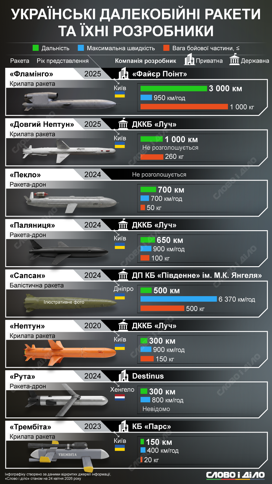 Украинские ракеты дальнего действия, которые в ходе полномасштабной войны успешно наносят удары по целям российских оккупантов, производятся как государственными, так и частными компаниями. Подробнее о производителях ракет «Фламинго», «Длинный Нептун», «Пекло», «Паляница», «Нептун», «Сапсан», «Рута», «Трембита» – на инфографике.